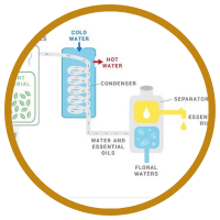 - Chất lỏng phụ phẩm thơm rơi ra từ Thiết bị ngưng tụ và tích tụ bên trong một thùng chứa bên dưới nó, được gọi là Thiết bị phân tách. Bởi vì nước và dầu không trộn lẫn, tinh dầu nổi lên trên mặt nước. Từ đây, nó được rút ra. (Một số loại tinh dầu nặng hơn nước, chẳng hạn như tinh dầu đinh hương, vì vậy chúng được tìm thấy ở dưới cùng của Dấu phân cách.)